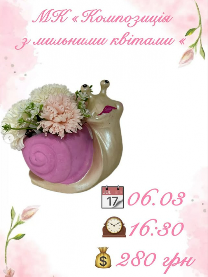 - Квітковий равлик — кашпо з ніжними мильними квітами. Дітки створять об’ємну композицію, навчаться правильно розміщувати елементи та працювати з декоративною зеленню.