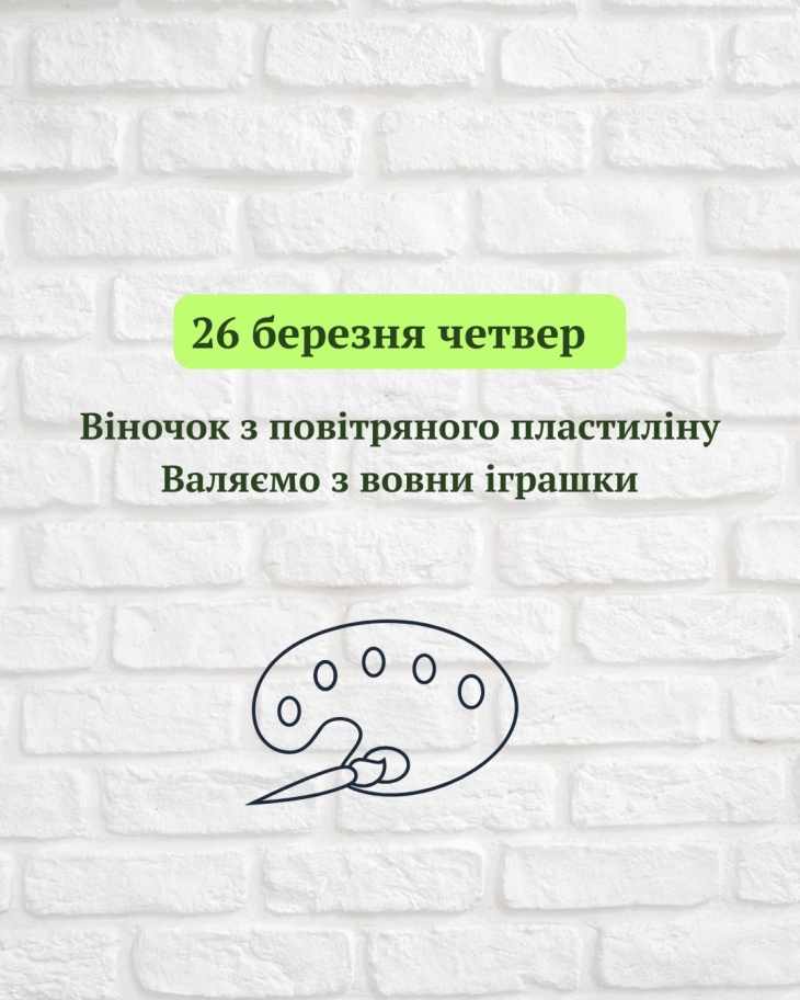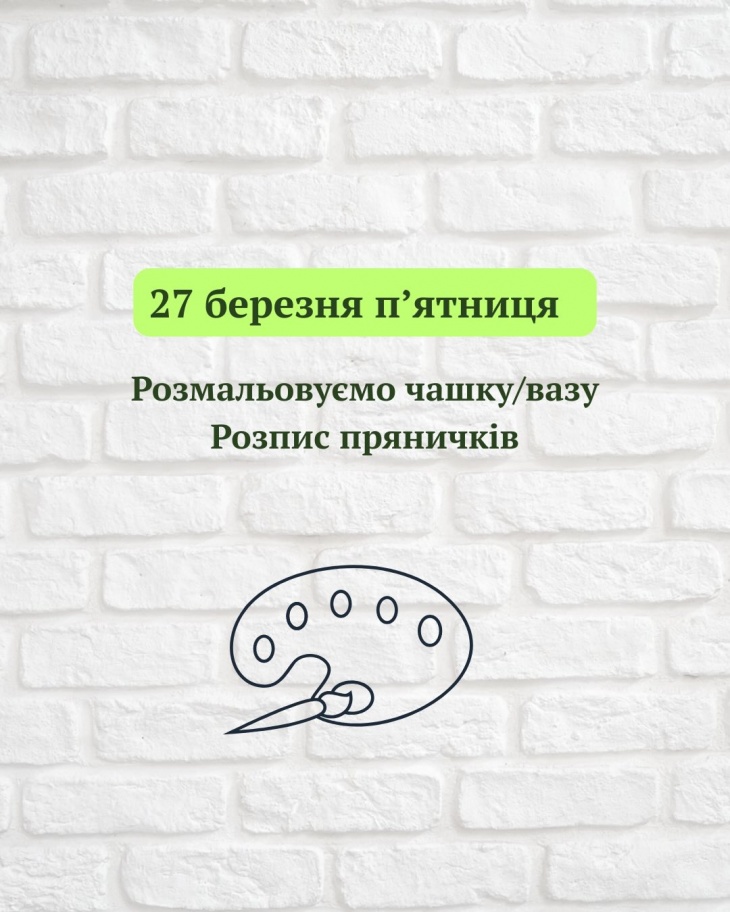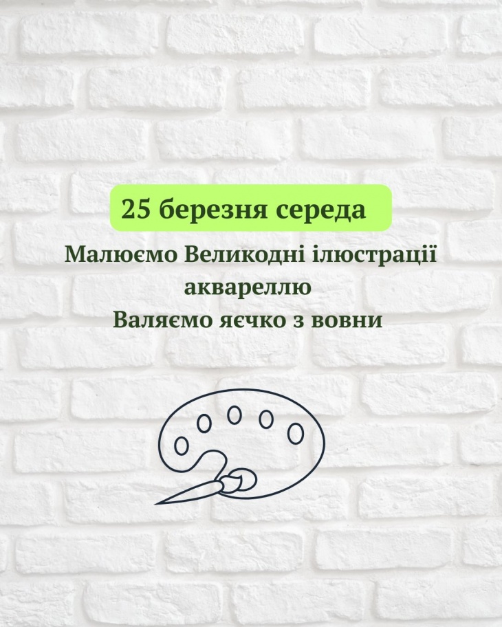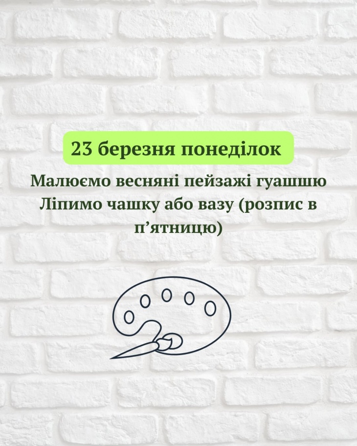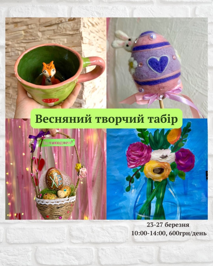 З 23 по 27 березня по буднях буде проходити творчий табір, з 10:00 по 14:00.