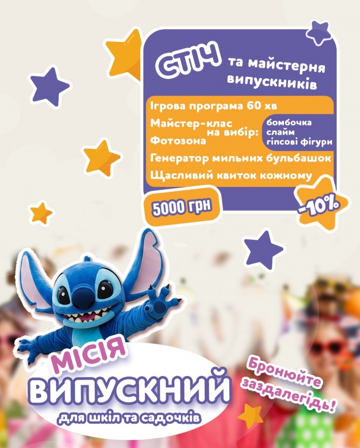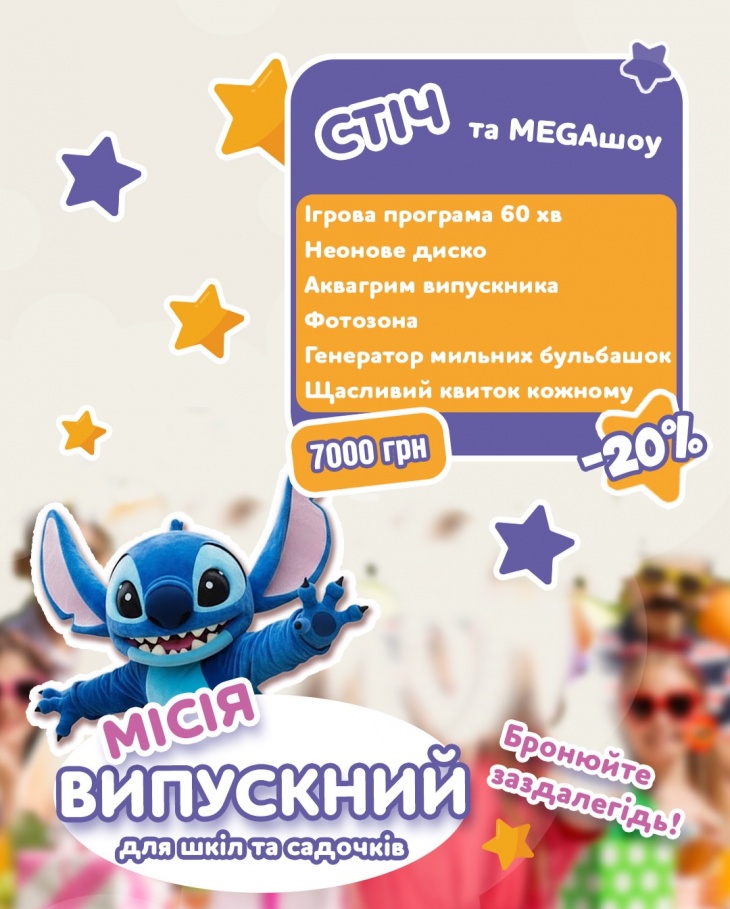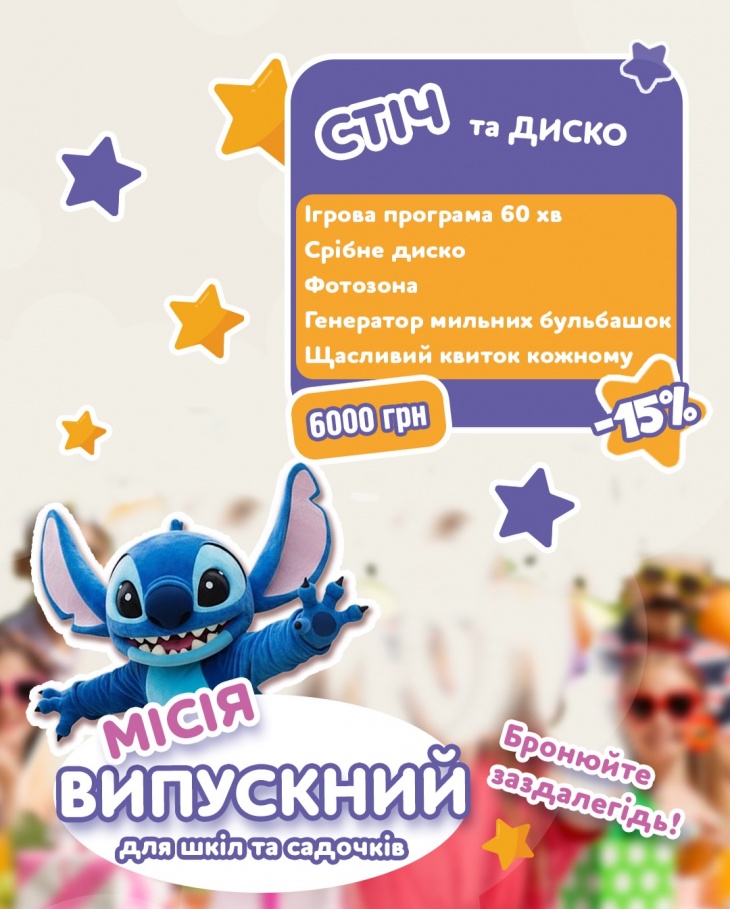 На дітвору чекатимуть веселі розваги на ваш вибір: авторські програми з героями, шоу, МК, аквагрим, фотозона, мильні бульбашки, кожному випускнику знижка на вхід та "Щасливий квиток" - картка подарунків на літні відвідування!