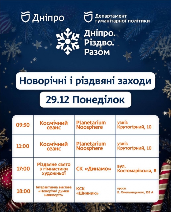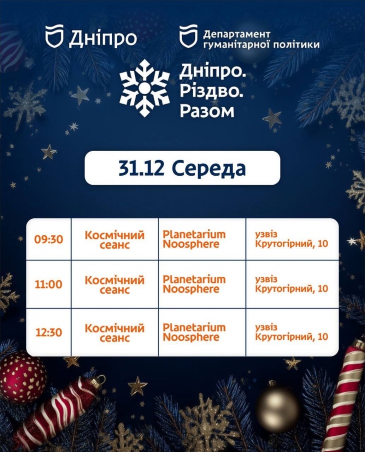 - 14:00 – Різдвяні пригоди + майстер-клас, Музей історії Дніпра, вул. Воскресенська, 14