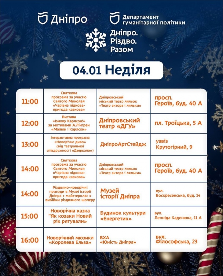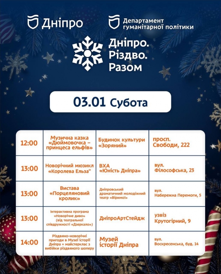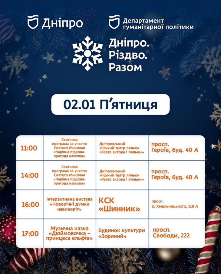 - 13:00 – «Новорічне диво», ДніпроАртСтейдж, узвіз Крутогірний, 9