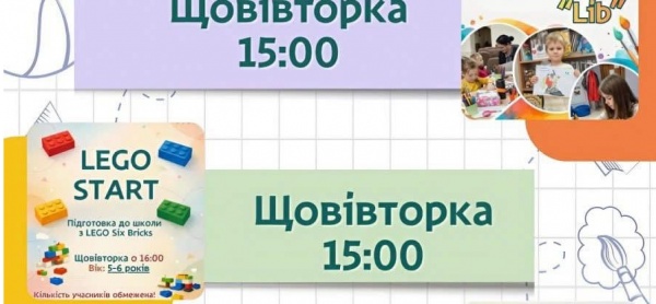 Щовівторка о 15:00 — ізостудія «Lib» та підготовка до школи з LEGO Six Bricks “Lego Start”