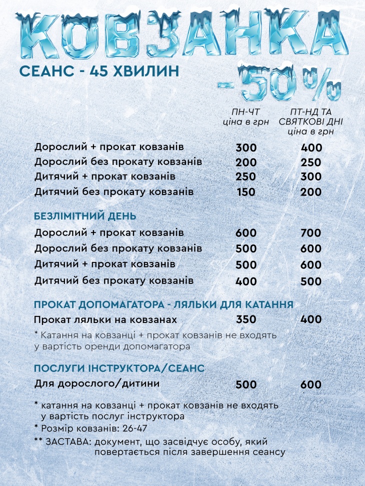 Тут ви зможете знайти все необхідне для катання на ковзанах: роздягалки, оренда ковзанів від 26-47 розмірів та допомога досвідчених інструкторів, а також тепла смачна їжа та напої.