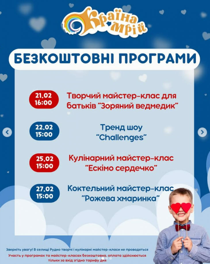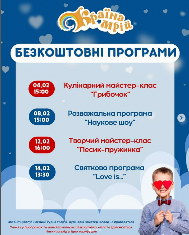 Ви сплачуєте лише вартість вхідного квитка дитини згідно тарифу дня, участь у майстер-класі та розважальних програмах безкоштовна.