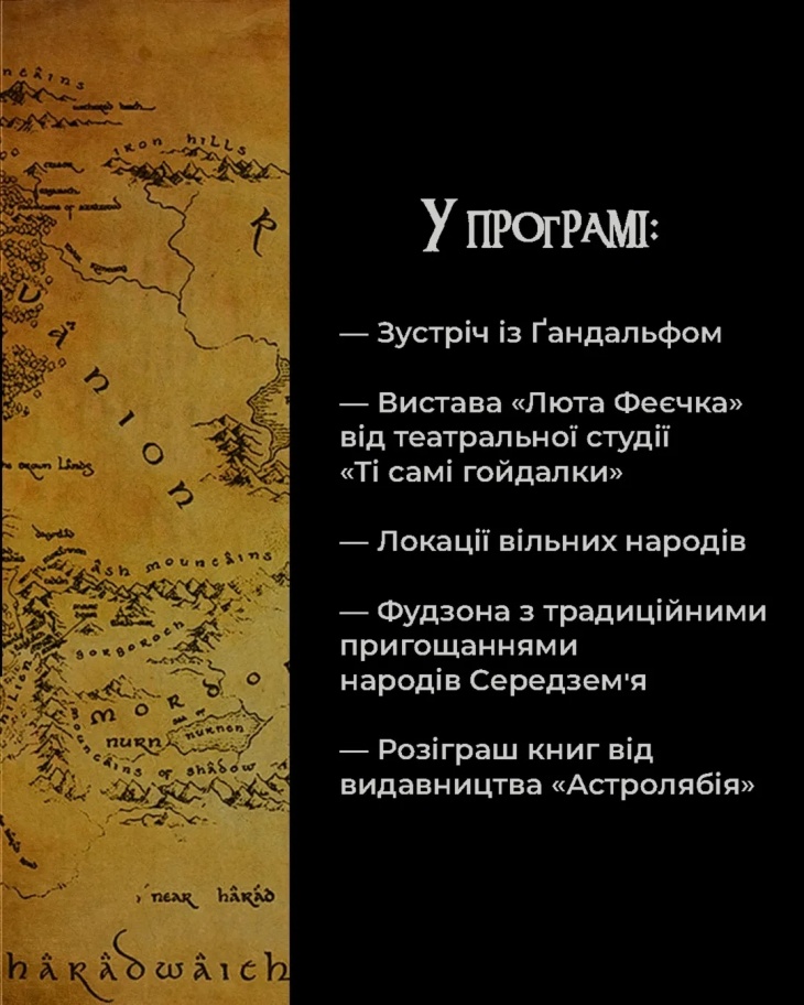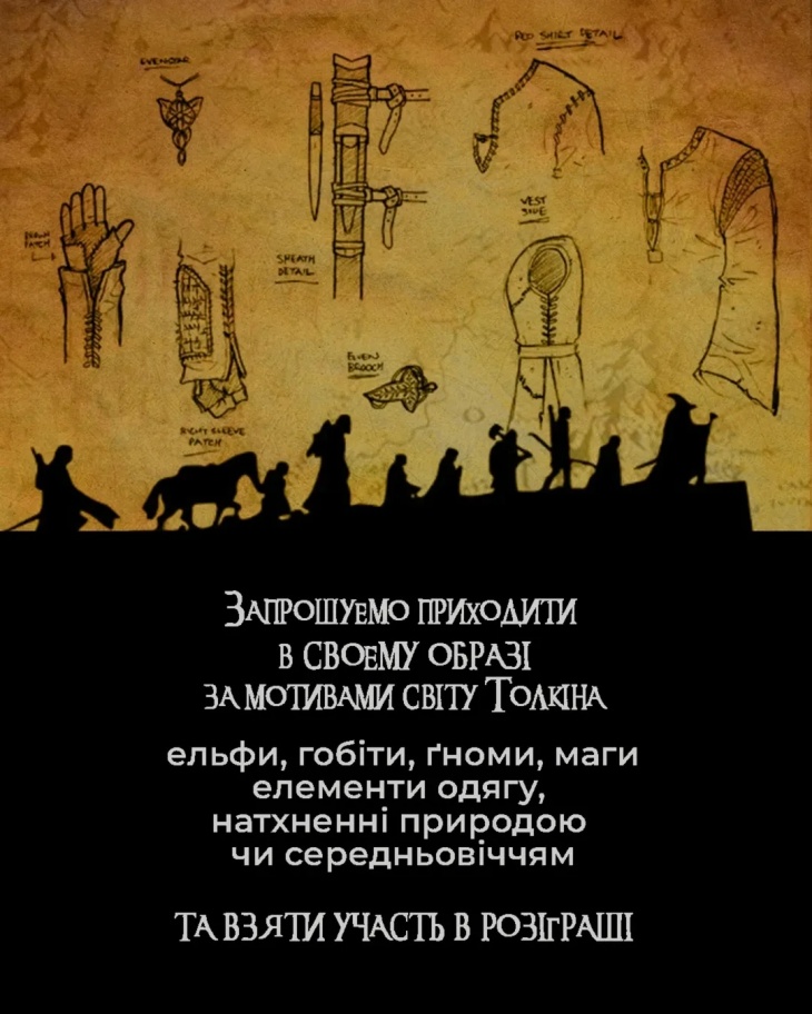 Закликаємо приходити в образах у стилі Середзем’я: ельфи, гобіти, гноми, мандрівники, маги чи інші істоти, що населяли світ Толкіна. Також доречні елементи одягу, натхненні природою чи середньовіччям