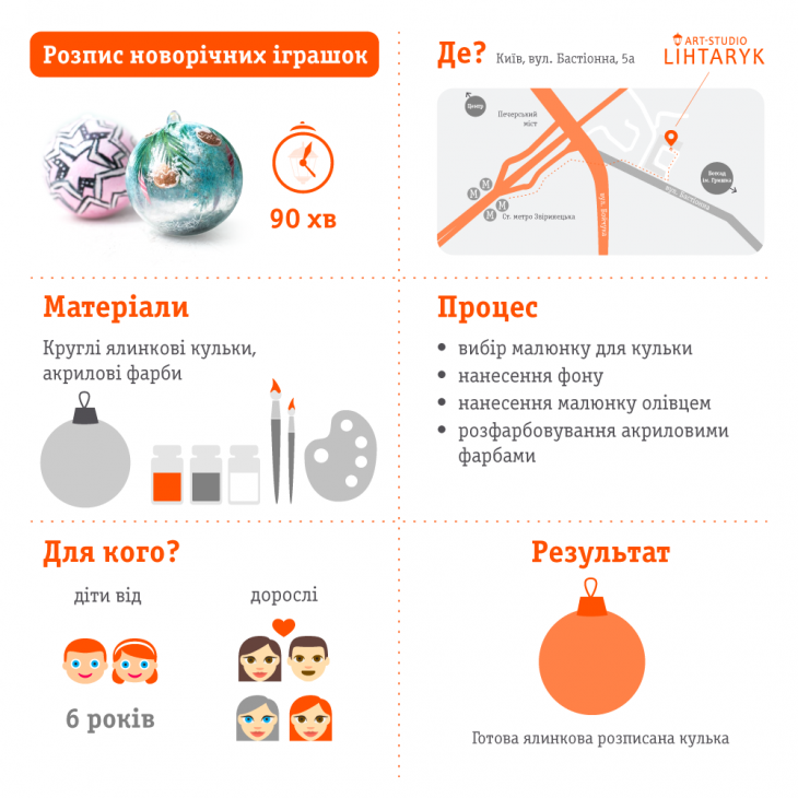 Напередодні різдвяних свят артстудія “Ліхтарик” запрошує всіх бажаючих створити чарівну красу власноруч. На майстер-класі з розпису новорічних іграшок у Києві ми розмалюємо ялинкові кульки яскравими та неповторними візерунками. Можна подарувати такі іграшки на свято близькій людині, колегам, родичам або прикрасити ними власну оселю, створивши чарівну новорічну атмосферу.