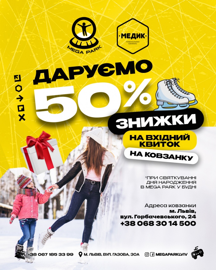 у вихідні для багатодітних сімей та сімей учасників бойових дій, за наявності відповідних документів: 350 грн (знижка на вхід 50 грн)