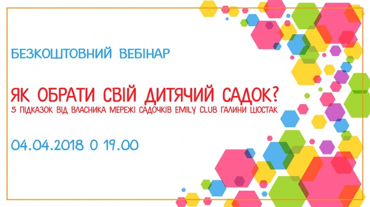 Emily Club запрошує вас безкоштовний вебінар "Як обрати свій садок: 5 підказок від власника мережі дитячих садочків Галини Шостак", який відбудеться 4 квітня.