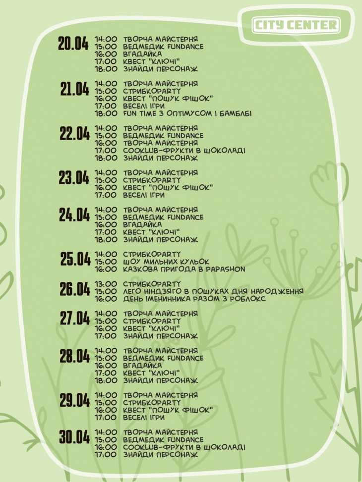 З 20.04 по 26.04 – щодня безкоштовні арт-програми.