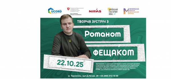22 жовтня о 13:00 в Тернопільській обласній бібліотеці для молоді відбудеться творча зустріч із поетом Романом Фещаком