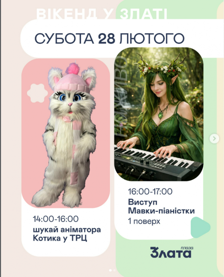 - 14:00–16:00 - шукайте аніматора-Котика у ТРЦ та ловіть гарний настрій.