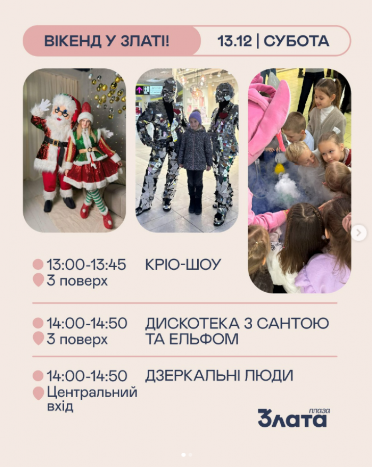 - У суботу почнемо день із атмосфери свята: дзеркальні люди, кріо-шоу та запальна дискотека з Сантою та Ельфом!