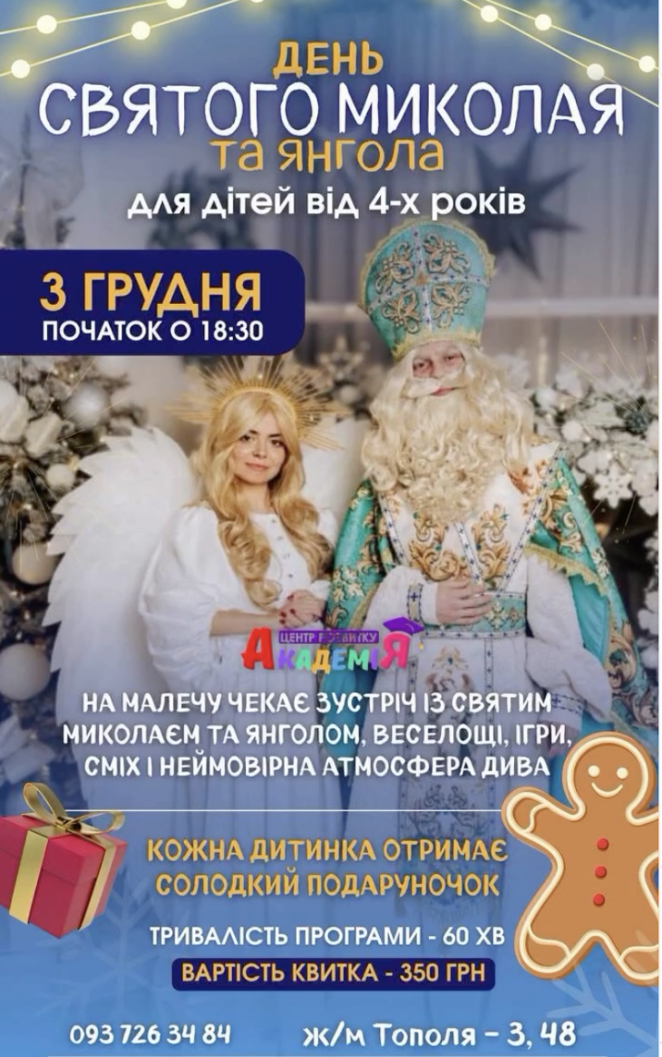 На програмі зі Святим Миколаєм та Янголом дітки зануряться в справжню казкову атмосферу та новорічну магію. Разом з героями відправляться до зимового лісу та пройдуть через холодну завірюху, пограють зі сніжинками, знайдуть всі новорічні атрибути та розвісять їх, пограють в улюблену гру Миколайчика. І звичайно, отримають подаруночки!