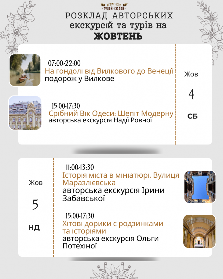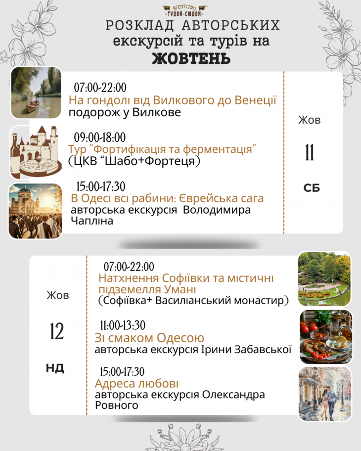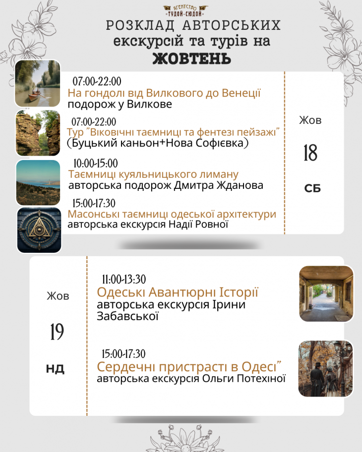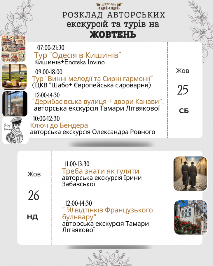 Жовтень в Одесі — це коли місто вдягає шарф, море вчить дихати повільніше, а прогулянки раптово смакують, як гарбузовий латте (але без черги). Ми підготували розклад регулярних екскурсій і виїзних турів на місяць, щоб кожен ваш вихідний — і навіть будній — мав свій «вау!».