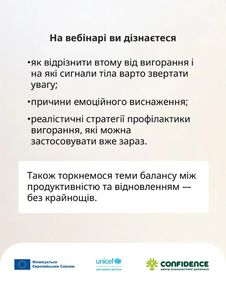 Запрошуємо батьків, піклувальників, фахівців, які працюють із дітьми та всіх, кого цікавить тема, на вебінар «Коли продуктивність виснажує: чесно про емоційне вигорання».